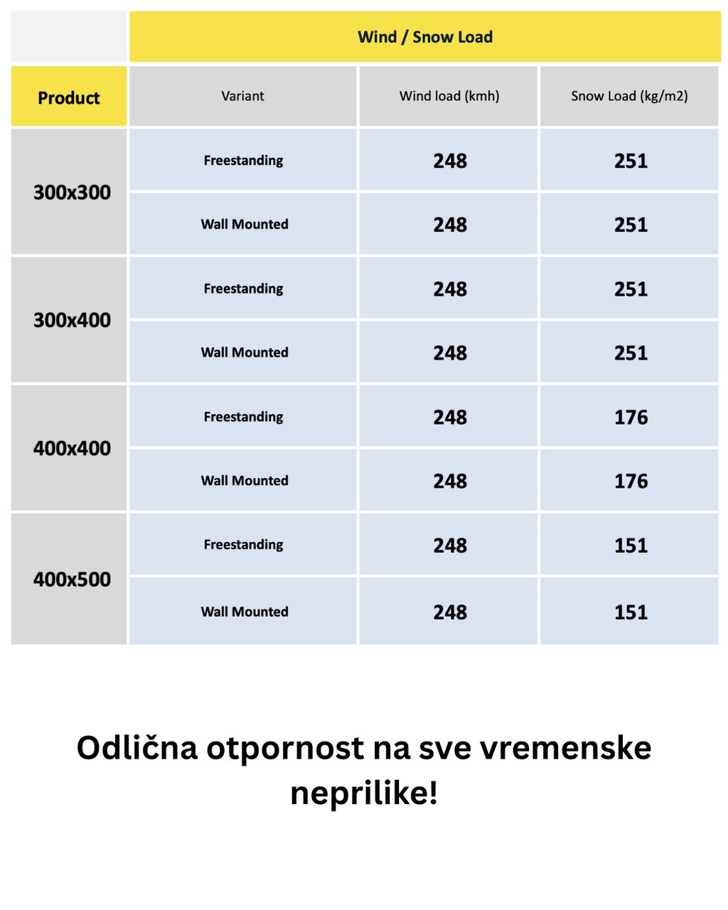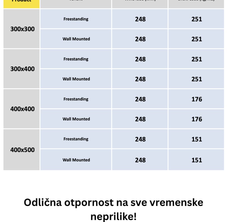This table shows the precise resistance values of the structure to wind and snow, calculated in accordance with European technical standards, thereby guaranteeing the safety and longevity of our pergola.